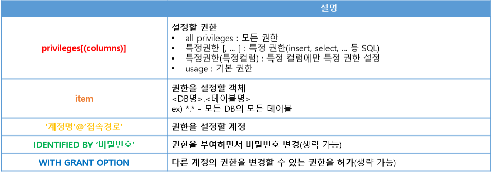 mysql> GRANT privileges[(columns)] ON item TO ‘계정명'@’접속경로' [ IDENTIFIED BY ‘비밀번호’ ] [ WITH GRANT OPTION ]