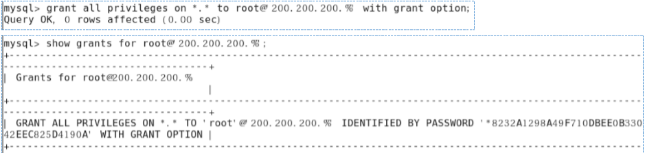 grant all privileges on *.* to root@200.200.200.% with grant option;