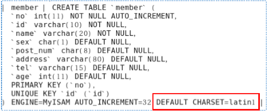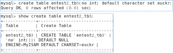 mysql> create table <테이블이름>(컬럼 설정) default character set <문자셋> [ collate <콜레이션> ];