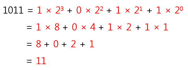 그러므로 2진수 1011 을 10진수로 변환하면 11 이 됩니다.^^