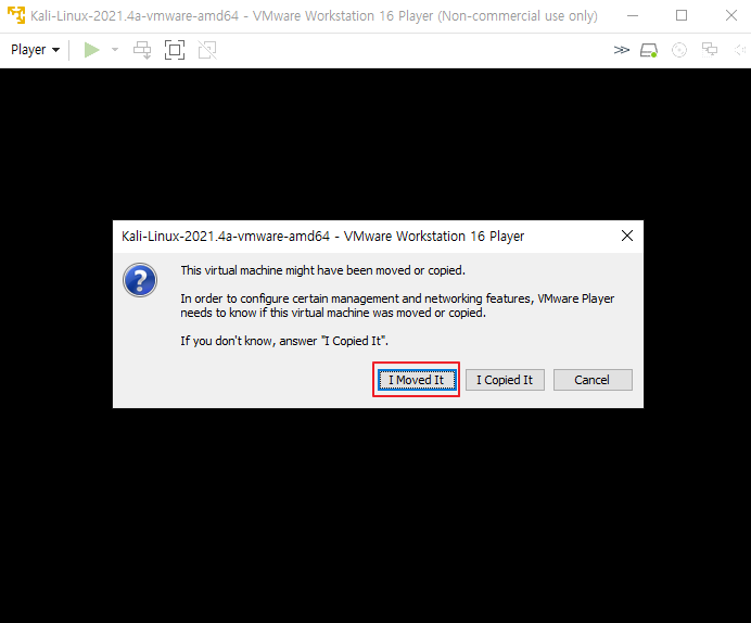 Kali-Linux-2021.4a-vmware-amd64.vmx 파일을 더블클릭해서 실행한다.