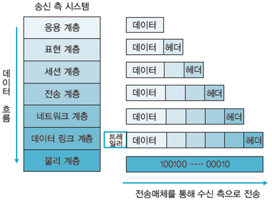 이렇게 응용 게층에서의 요청 데이터는 전송 계층 헤더, 네트워크 계층 헤더, 데이터 링크 계층 헤더와 트레일러가 추가됩니다.
